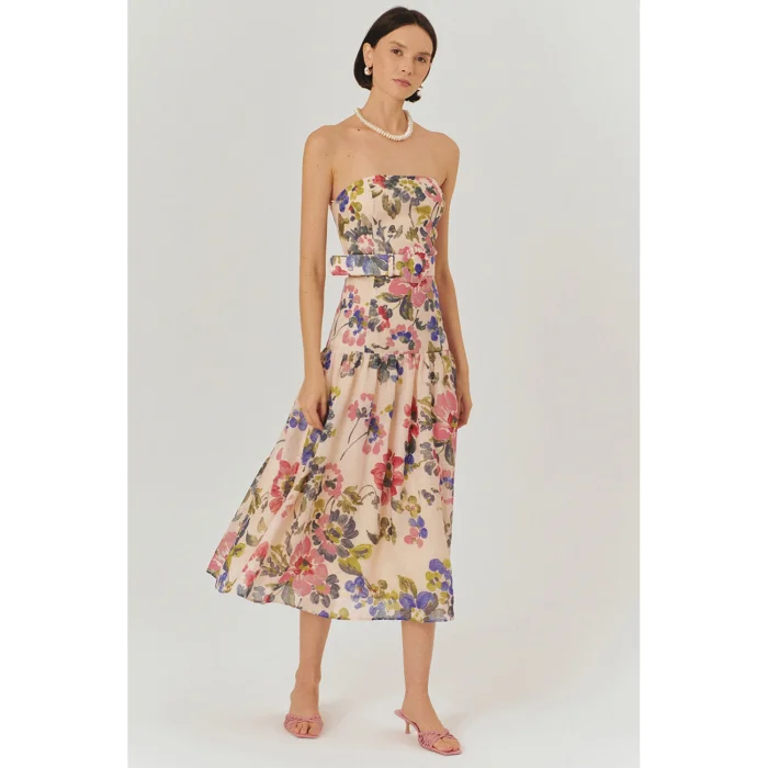 Product: Belt Detailed Floral Patterned Strapless Midi Dress