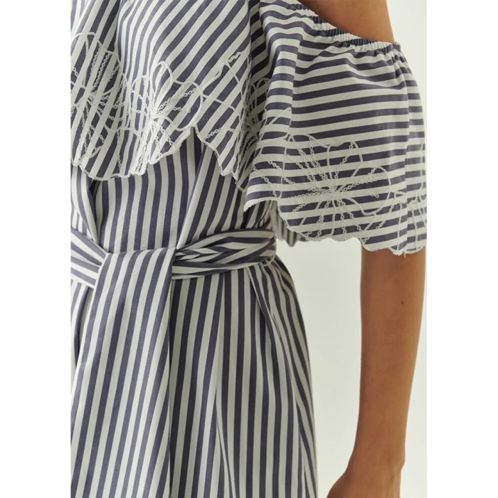 Product: Embroidered Detailed Striped Off-the-shoulder Ruffle Midi Dress