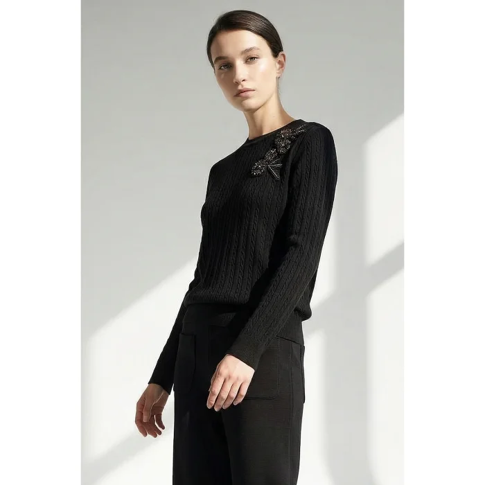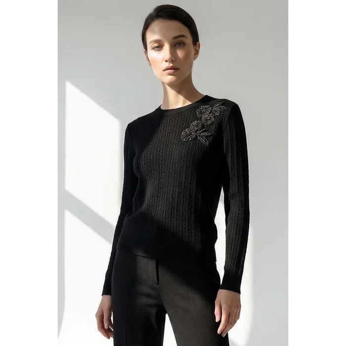 The sweater, which draws attention with its knitwear textured surface, elegantly enriches its simple form thanks to the embroidered floral appliqués on the shoulder. While its soft and flexible texture offers comfortable use, its fit cut creates a look that can be easily preferred in casual and stylish combinations.