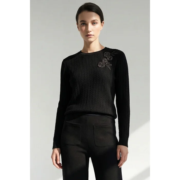 Long Sleeve Crew Neck Floral Embroidered Knitwear Sweater