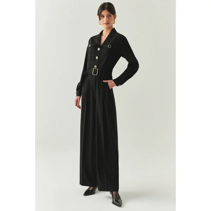 Product: Long Sleeve Jacket Collar Pocket Belted Slim Fit Jumpsuit