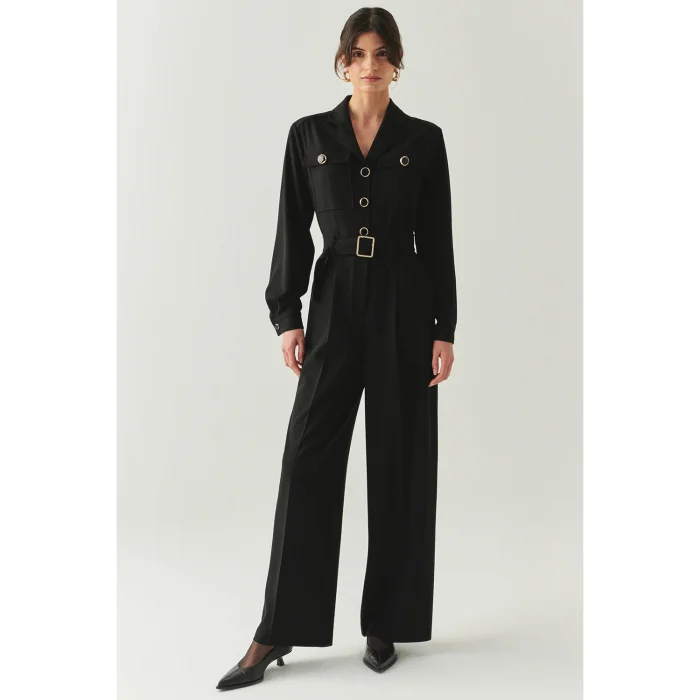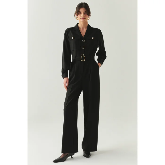Long Sleeve Jacket Collar Pocket Belted Slim Fit Jumpsuit