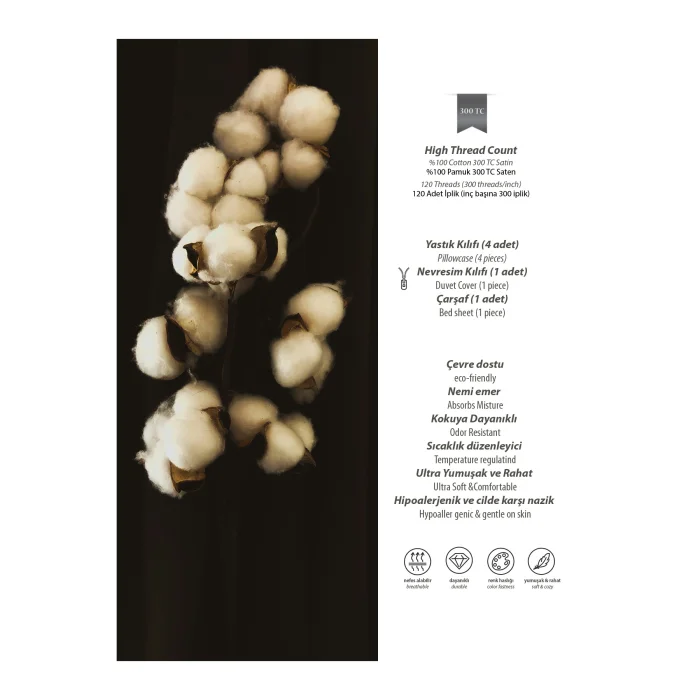 Made of 300 TC (yarn density) fabric with high quality standards; The fabric weaving density is 120 strands; Thanks to its high thread count, it offers a soft and durable structure; Set contents and size details: Duvet cover: 200x220 cm; Bed sheet: 240x260 cm (Large size, ideal for large beds); Patterned pillowcase: 50x70 cm (2 pieces); Flat pillowcase: 50x70 cm (2 pieces); There are a total of 4 pillowcases.