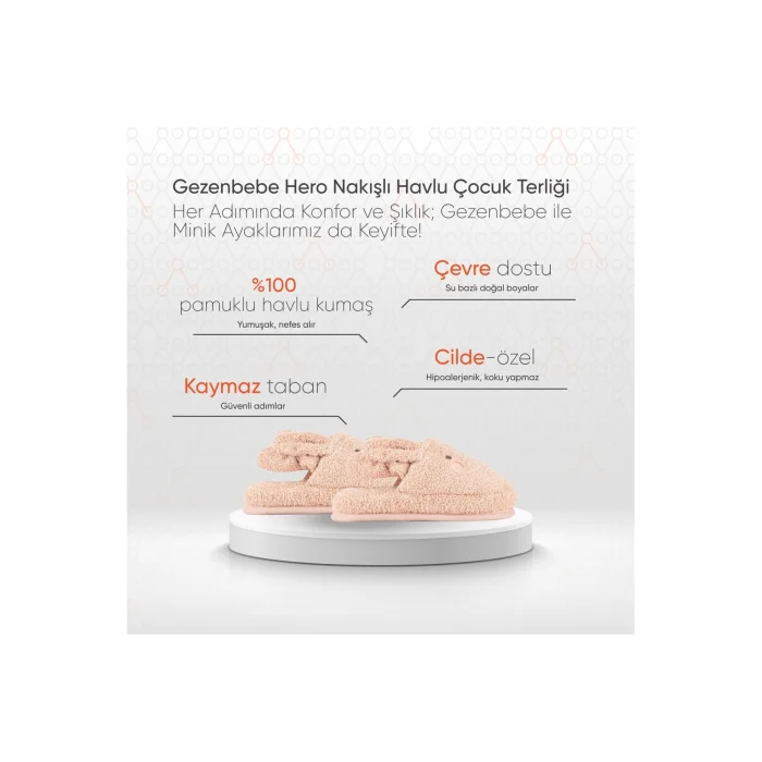 Product Description:Gezenbebe Hero Embroidered Terry Children's Slippers: The comfortable hero of tiny steps! Gezenbebe Hero Embroidered Towel Children's Slippers bring tiny feet together with elegance and offer an extremely comfortable experience. This slipper, which is given an elegant look with pastel tones, will win your admiration with the detailed embroidery of Gezenbebe's cute heroes, Elephant, Rabbit, Teddy Bear and Koala. The soft texture of the terry cloth comfortably wraps around your child's feet, providing a comfortable use after a bath or on the beach. Thanks to its elastic structure, these slippers, which can be used between the ages of 2-4, are in perfect harmony with the bathrobes and ponchos of the collection. Designed for tiny feet, this special slipper is with you every step of the way with its Gezenbebe quality and aesthetics. Salient Features:UNIQUE GEZENBEBE DESIGN: These special slippers, which color your baby's bath and beach hours with cute hero embroidery, combine style and functionality. QUALITY COTTON FABRIC: Gezenbebe Hero Embroidered Terry Children's Slippers have a breathable and soft texture and offer the highest level of comfort for the sensitive skin of the little ones. SAFE STEPS: Thanks to its non-slip sole, it allows you to take safe and carefree steps at home or outside. FLEXIBLE FIT: Its rubberized structure provides a perfect fit for growing feet and allows for long-term use. SPECIAL FOR SENSITIVE SKIN: It minimizes the risk of allergic reactions with its hypoallergenic structure, easy washability and odorlessness. UNIQUE GIFT OPTION: With its cheerful colors and unisex design, it creates an ideal gift option for all the little ones. USE OF NATURAL DYES: Water-based dyes that are environmentally friendly and do not harm baby health are preferred in printing. CUSTOMER SATISFACTION ORIENTED: As Gezenbebe, we are constantly improving ourselves to offer the best in every detail, taking into account customer feedback. Technical Details: It is made of high quality terry fabric with high absorbency. In this way, it keeps the tiny feet dry and comfortable. Product Size: 2-4 years old. Color Options: Bunny (Rabbit), Elephant (Elephant), Koala (Koala) and Teddy (Teddy) Care Instructions: Wash at 30 degrees and dry without exposing to direct sunlight. Let the little feet take both comfortable and stylish steps with terry slippers! With its exclusive design and quality, it is a candidate to be your child's favorite slipper.
