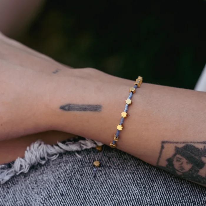 Morning bracelet is produced with flower shaped 18 carat gold plated brass beads. There are blue colored glass beads between the brass beads.