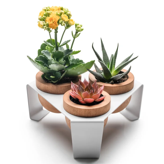 It's a hand made item crafted carefully emphasize the naturalness of wood and elegant surface of metal. Pots are made of Oak Wood which have a very smooth and beautiful surface with perfect curves. With it's stylish White Metal Stand, this succulent planter set is ideal for displaying on tables, shelves and windowsills.