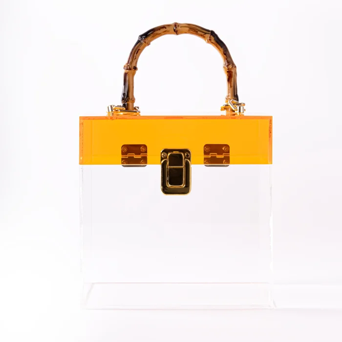 Stylish, acrylic, handmade, design handbag with bamboo handle with stainless accessories and locking mechanism