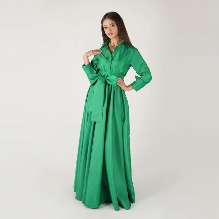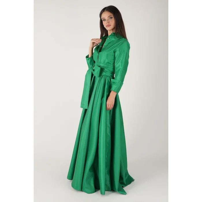Product: Belted Green Taffeta Long Shirt Dress