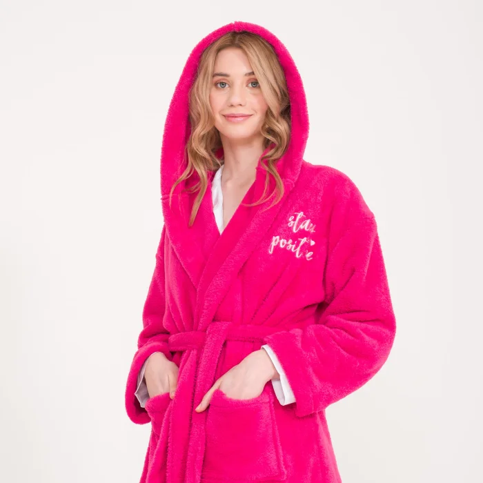 The motto embroidered over-the-knee fleece dressing gown provides a good start to the day.