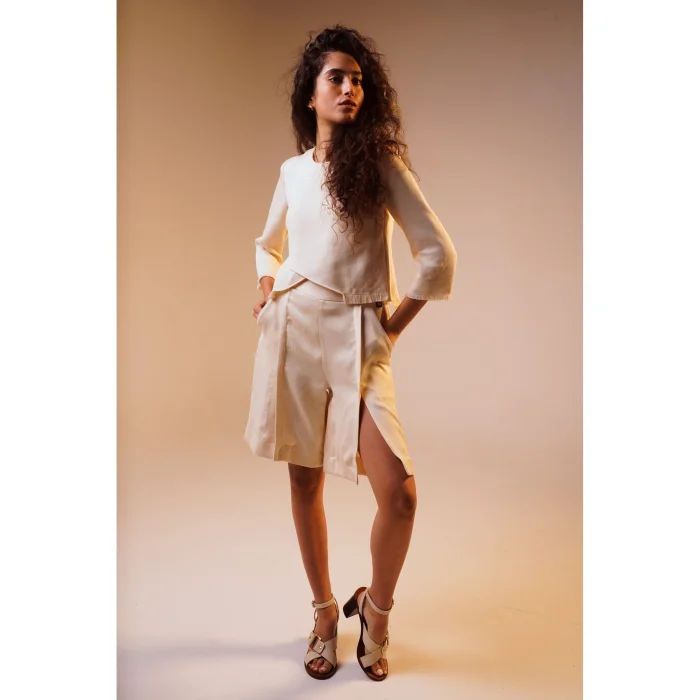 Introducing our chic Pleated Shorts, the perfect blend of classic elegance and modern style! These high-waisted shorts feature a pleat front with a small opening hem, exuding sophistication with every detail. Crafted with a side zip for easy wear, they offer both style and comfort. For a chic day look, pair these shorts with a tailored shirt for a timeless ensemble with a contemporary twist. Alternatively, elevate your style by coordinating them with our matching Pearl Jacket for a sophisticated and cohesive outfit that's perfect for any occasion. What our team have to say: These shorts are the ultimate go-to for achieving a chic look with a unique twist on classic dressing. Add them to your wardrobe for effortless style and versatility. Kate - Out of Sync Founder Retail details: Pleat front with small opening hem Side zip High-waisted Composition:33% Tencel LUX 67% Tencel