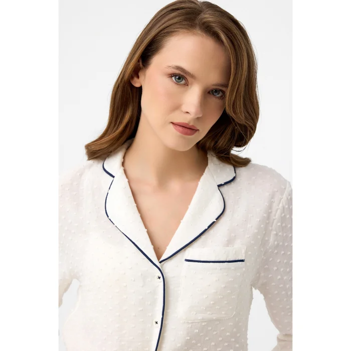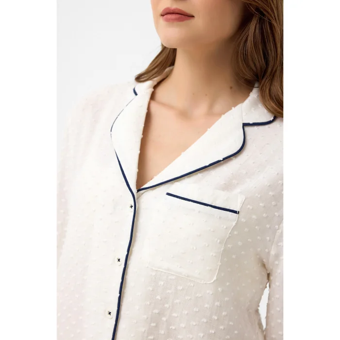 100% cotton double-layer muslin fabric, white Lara pajama set.  Navy blue piping detail offers a stylish look. It provides comfortable use with its soft texture.  The trousers have pockets and can be adjusted to your waist thanks to the belt. The front buttoned top provides ease of use for breastfeeding women.