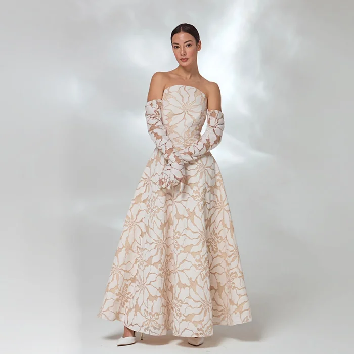 A strapless dress with matching glove details.