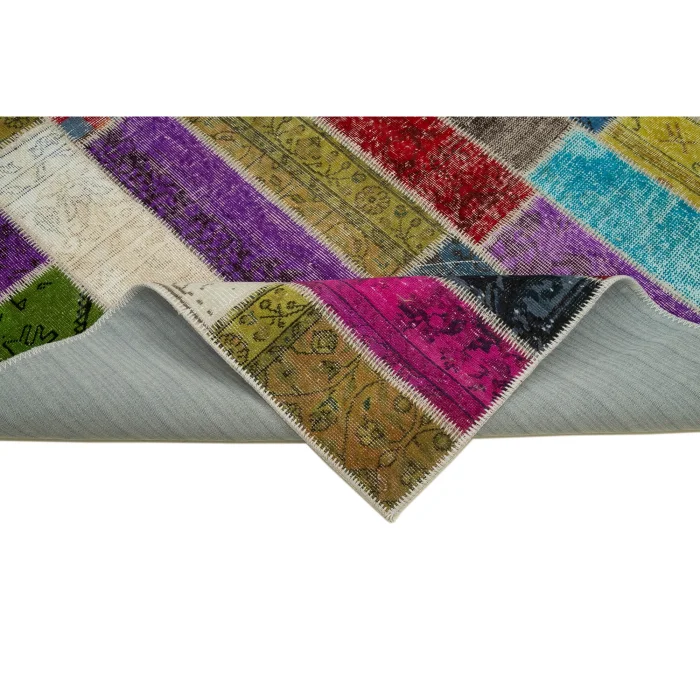 Modern Dizayn Patchwork Carpet is 203 cm wide, 300 cm long and approximately 5 mm thick. It weighs an average of 18 kg. It is made with hand-spun wool and cotton. It gets its colors from root dyes obtained naturally.