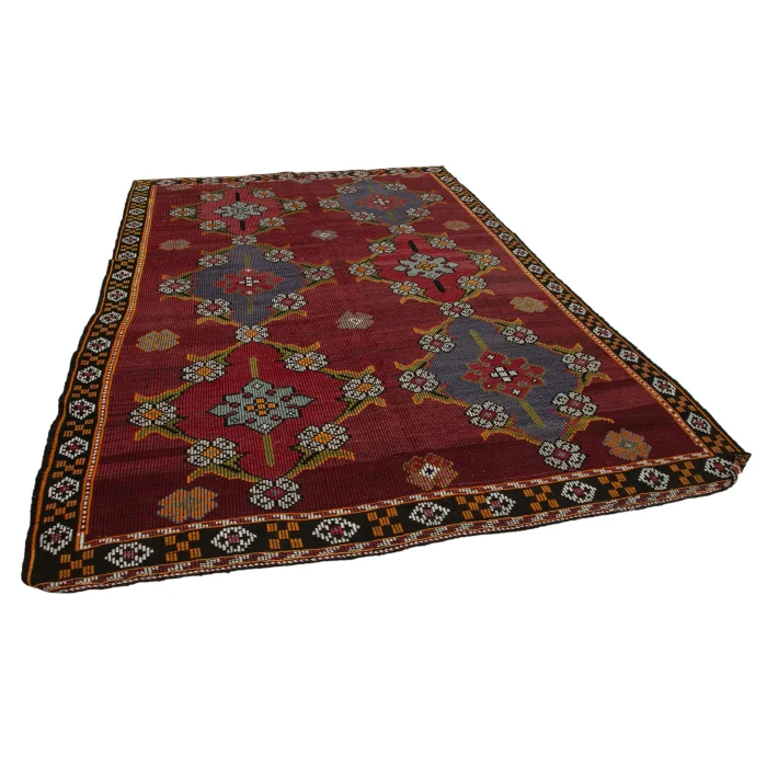 Vintage Cecim kilims are on 223 cm width and 326 cm length and the pile height is 5mm, the approximate weight of the rug is 15 kg. It’s % 100 handknotted wool and goat hair rug. It’s made from the natural dye.