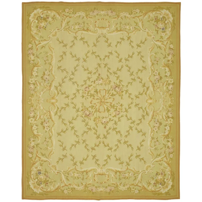 The Aubusson Rug is 239 cm wide by 300 cm long and about 5 mm thick. It weighs an average of 8 kg. It is made with hand-spun wool and cotton. It takes its colors from root dyes obtained naturally.