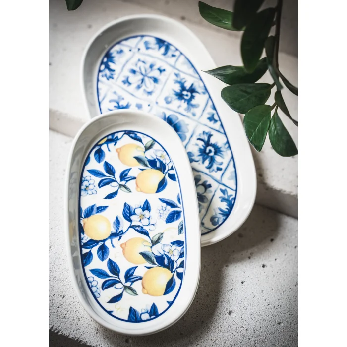 Odore Di Limone Oval Serving Plate The product consists of two parts. Product Size; Length: 26x14 cm It is a new generation ceramic production. It is suitable for dishwasher use. The Odore Di Limone Series Oval Serving Plate, which will make your presentations more elegant and encourage your guests, will be the dazzling detail of the tables. With its pattern and stylish colors, it will add nobility to your tables. These oval serving plates, which allow you to set stylish tables, will also be a pleasant gift for your loved ones who pay attention to every detail.