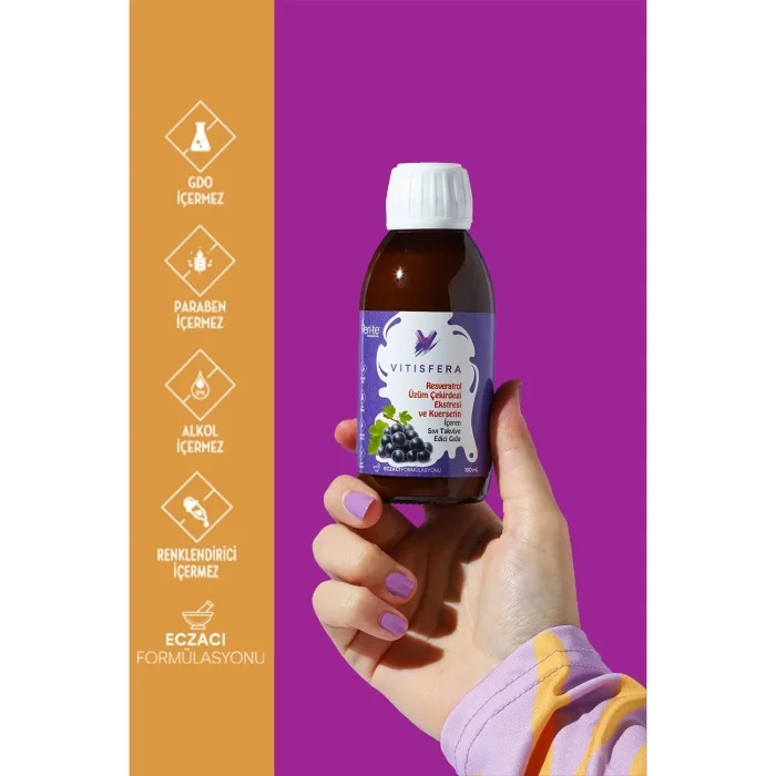 Resveratrol in the content of Vitisfera Resveratrol Shot Forest Fruits Flavored Food Supplement is obtained from Veri-Te®, Switzerland's registered and patented trans-Resveratrol brand, while Quercetin is obtained from Sophorae Japonica plant with 95% purity and Grape Seed Extract is obtained from natural grape seed with 96% purity.