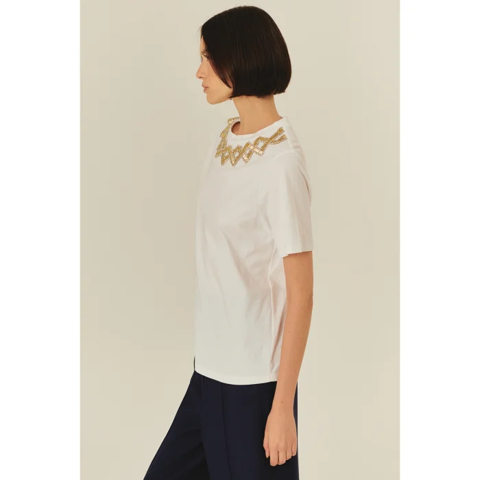 Product: White Cotton T-shirt With Crew Neck And Embroidery And Stone Details