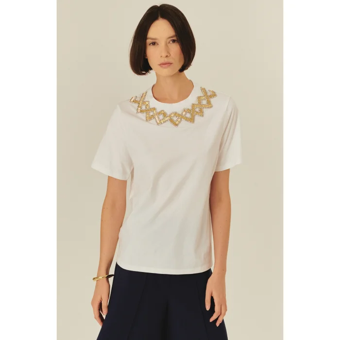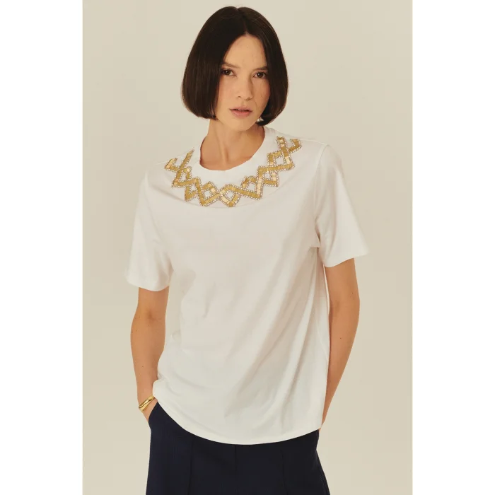 Product: White Cotton T-shirt With Crew Neck And Embroidery And Stone Details