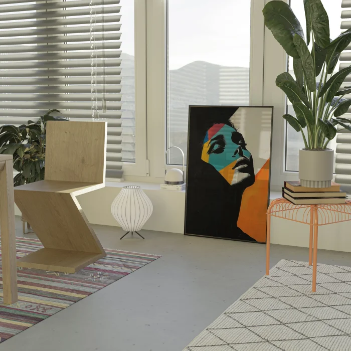 A thought profile fragmented by geometric colors that contrast with human elegance.