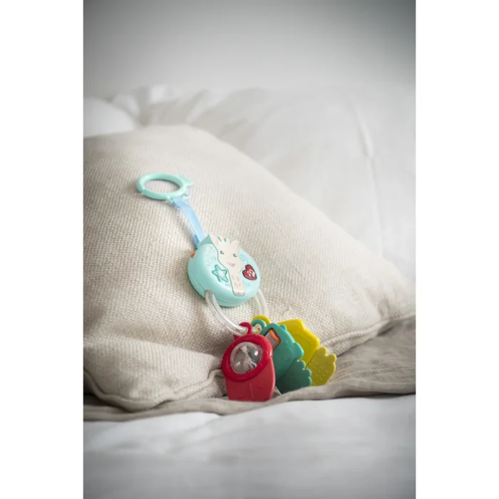 Sophie la girafe Lights & sound sound and light key rattle A cute electronic rattle in the image of Sophie La Giraffe, with a variety of activities to awaken your baby's senses! 2 game modes to choose from: Electronic rattle: A variety of melodies that can be listened to by pressing buttons. The light flashes to the beat of the music! Classic rattle: Colorful balls to shake and rattle keys to listen! A variety of activities to explore: All keys are made of soft material to comfort the baby during teething; A transparent ball featuring the miniature Sophie la Girafe and rotating colored balls. A mirror where babies can discover themselves. On it is a rotatable cylinder for changing characters. Thanks to its round shape, it is very easy to grasp and at the same time ideal for introducing cause and effect to the baby. It is practical, thanks to its small size, it accompanies your baby wherever it goes, and thanks to its ring, it can be worn anywhere. Batteries: 2 x AAA included. Packing size:H 290 x L 170 x D 80 mm Recommended age: 3 months+