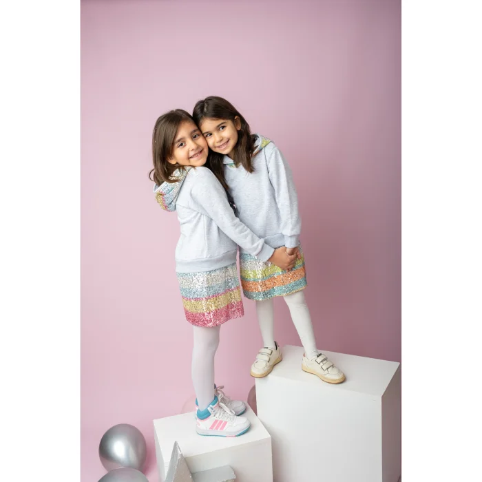 The colorful sequin skirt offers a fairytale look.