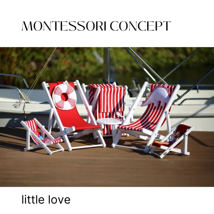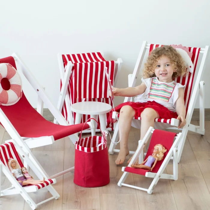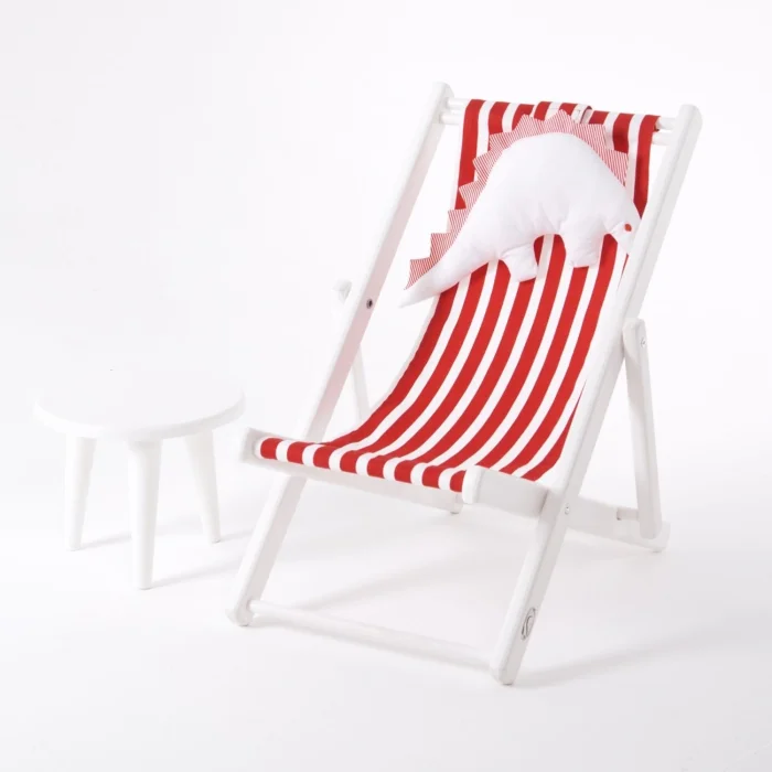Two-stage solid wood fun children's resting seat. Includes a dino pillow and a pink-and-white striped cushion. You can use our children's chair in both ways, reclining back and upright in a seated position. Opens & Closes & Disassembles.