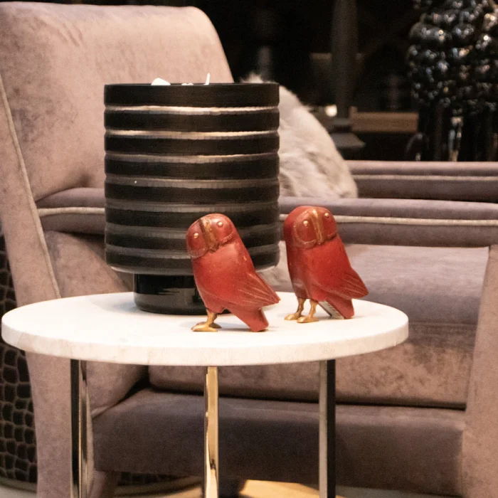 Care: Care for your accessories by dusting in regularly with a soft cloth. Clean by using a dry or slightly damp soft cloth, follow by polishing with a dry soft cloth. Do not use commercial polished or waxes as they can damage finishes. You may wash them with water and dry immediately with a soft cloth. Do not leave water in your metal or painted glass accessories as it can cause lacquers and paints to lift. If there is a need for water for fresh flowers use plastic or glass container or bottle inside the metal vase or bowl to protect the surface.