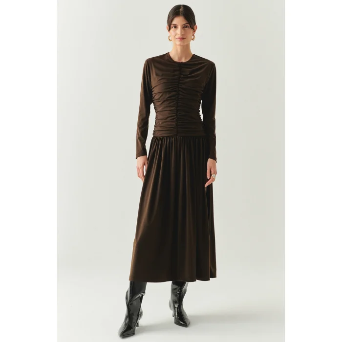 Crew Neck Long Sleeve Draped Slim Fit Midi Knit Dress