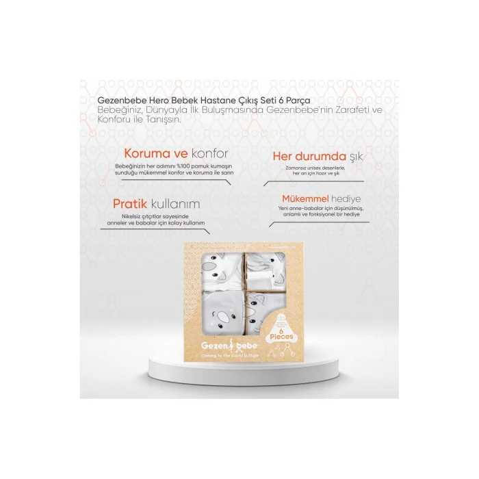 Product Description:Gezenbebe Hero Baby Hospital Outlet Set 6 Pieces: The Perfect Start for the First Big Day in Your Baby's Life! Prepare your newborn for the first important day in his life – the day he leaves the hospital. This special set from Gezenbebe is specially designed to offer your baby both comfort and style. With its gezenbebe quality and iconic patterns, it makes your little hero feel special from the beginning. Set Contents:EMBROIDERED HAT: Soft, breathable and embroidered hat with unique Gezenbebe heroes that will keep your baby's head warm. EMBROIDERED APRON: An embroidered apron inspired by the four heroes of Gezenbebe, offering a stylish solution for small accident moments. EMBROIDERED ZIBIN: A delicate staple decorated with iconic Gezenbebe patterns that will keep your baby clean and dry. BOOTIES: Comfortable pants with integrated booties that keep tiny feet warm. GLOVES: Soft gloves so your baby doesn't scratch himself. EMBROIDERED SHORT SLEEVE BODYSUIT: Breathable and soft short sleeve bodysuit that gently hugs your baby's skin, enriched with embroidery details from our four heroes. Standout Features:GEZENBEBE SIGNATURE:This set offers more than just a Hospital Exit Set; It is a fashion statement of Gezenbebe with its special patterns and detailed embroidery. FULL PROTECTION: Each piece in this set has been carefully selected to ensure that your baby is protected from head to toe. UNIQUE DESIGN OF GEZENBEBE: Elephant, Koala, Teddy Bear and Rabbit; The four beloved heroes of Gezenbebe bring your baby together with a unique elegance with this set.ULTIMATE COMFORT: Made of 100% breathable cotton fabric, this set offers your baby the highest comfort. UNISEX ELEGANCE: With its fashionable patterns, your baby feels ready in every sense. EASY TO USE: Nickel-free snap buttons offer quick and convenient use. GREAT GIFT: An ideal gift for new parents or your own baby. Technical Details:Size Options: 0-3 months, 3-6 months, 6-9 monthsColor Options: Bunny, Elephant, Koala, Teddy (Organic). Review the size chart before completing the order. With the Gezenbebe Hero Baby Hospital Exit Set, your baby is ready to meet the world in a stylish and comfortable way. Every moment is precious, and with Gezenbebe, these first moments are even more special.