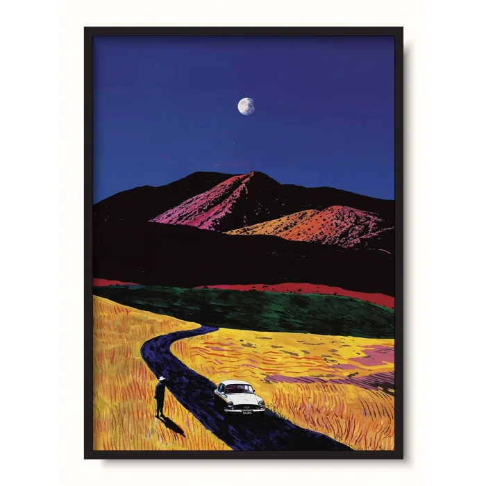 A car parked on the road that winds through the golden fields.