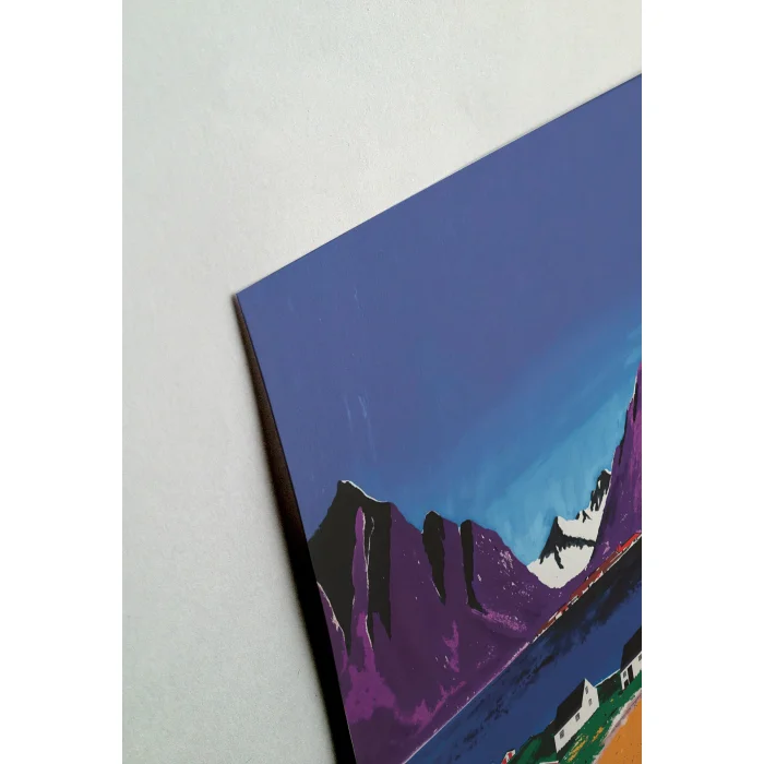 A vibrant coastal landscape with colorful houses next to a golden beach. A small boat resting on the shore. In the background, tall, dark mountains rising against a clear and deep blue sky.