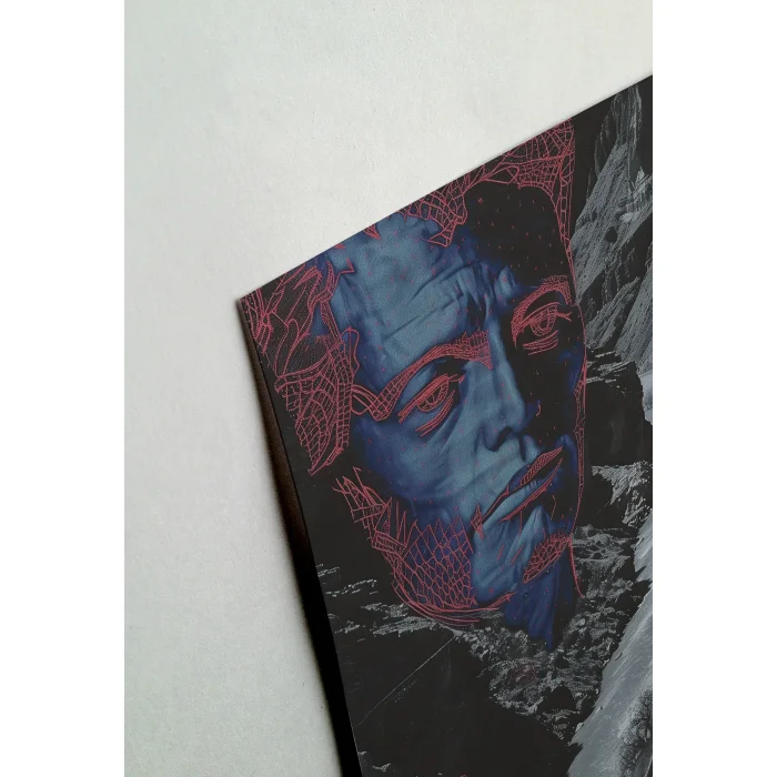 A composition of vibrant, neon blue outlines over a winter mountain road landscape.