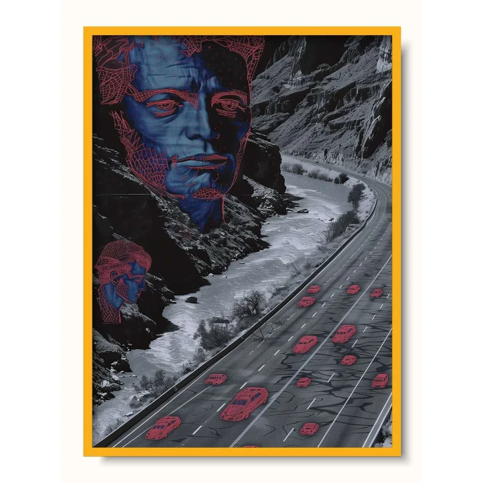 A composition of vibrant, neon blue outlines over a winter mountain road landscape.