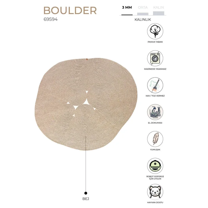 Boulder Collection, which is designed in an amorphous style by going beyond the classical carpet sizes and forms, is produced from a special yarn that is resistant to water and sun with its unique shapes. It is durable and suitable for use for many years. Usage areas: It is a functional carpet that you can use in every corner of your home with its unique structure. Suitable for areas with pets. Washing instructions: No machine washing. Wipe gently with a damp cloth.