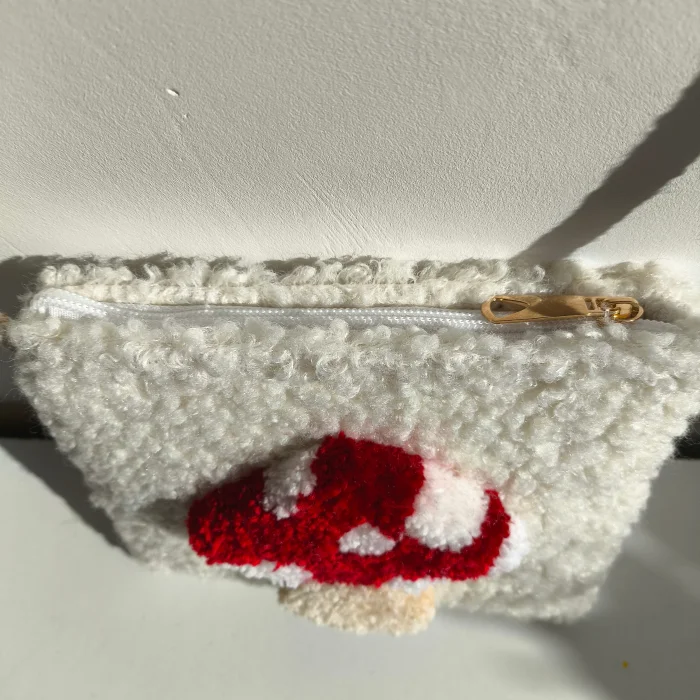 Design: Mushroom motif embroidered with tufting technique on fluffy teddy fabric.