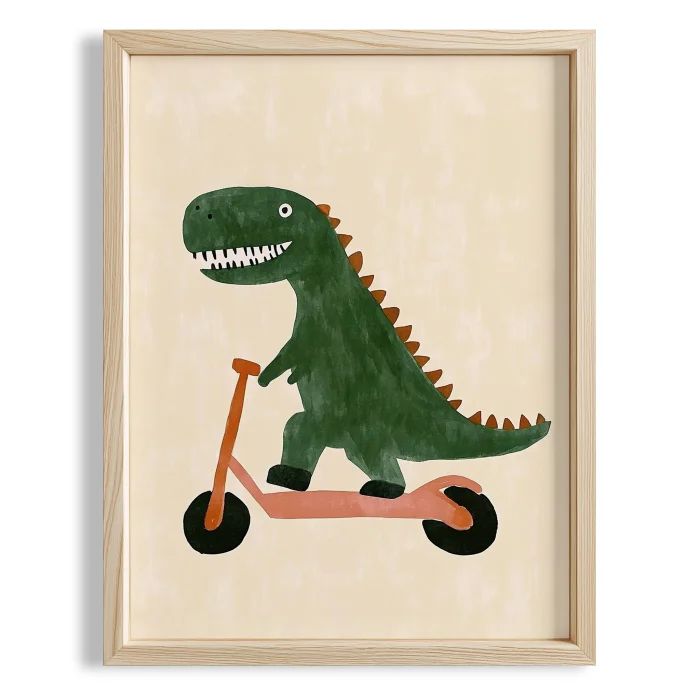 Product: Dinosaur Riding A Scooter -themed With Cream Background Kids' Room Wooden Wall Art I