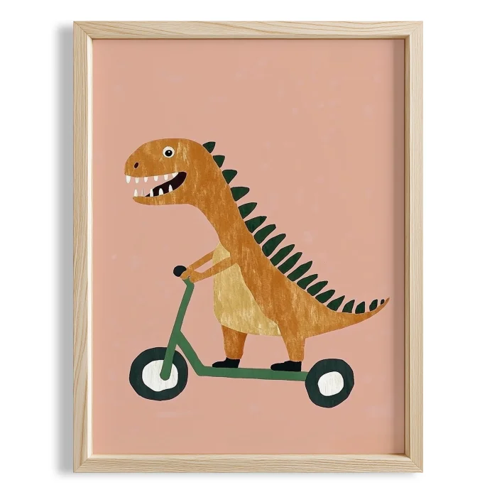 Product: Dinosaur Riding A Scooter -themed With Pink Background Kids' Room Wooden Wall Art