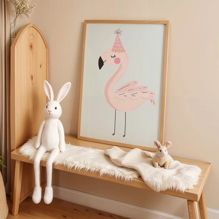 Product: Flamingo Wearing Party Hat Kids Room Wooden Wall Art