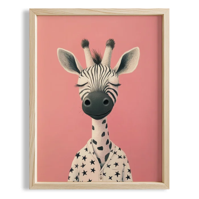 Product: In Pajamas Sleeper Zebra - Pink Background Children's Room Wooden Framed Wall Art