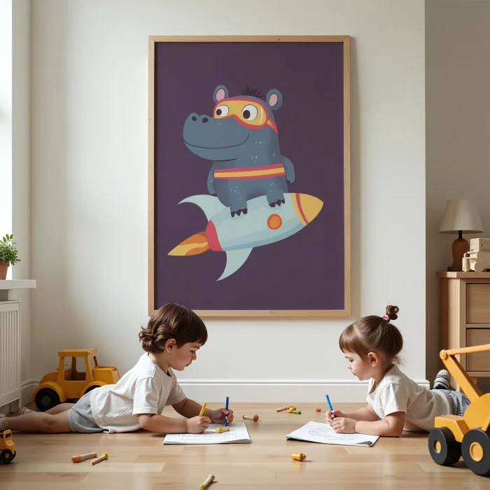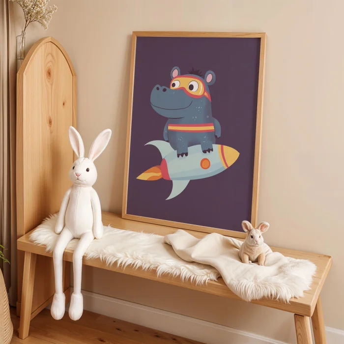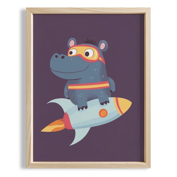 Roketli Süper Su Aygırı - Purple Background Children's Room Wooden Framed Wall Art