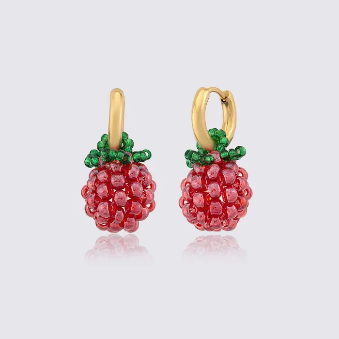 Custom design handmade glass bead raspberry earrings. Raspberry figure with gold-plated tarnishing surgical steel ring.