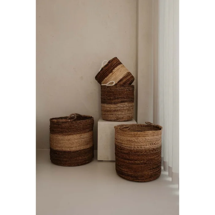 The round decorative wicker basket with bow handle combines the natural texture of banana fiber with the elegant bow handle design.; Thanks to its 6 cm handle size, it offers both aesthetic and practical use.; Because it is handcrafted, each piece is unique and slight variations may be seen in measurements; With four different size options: 46x49 cm, 43x44 cm, 38x40 cm and 34x39 cm, it is both a decorative and functional storage solution.
