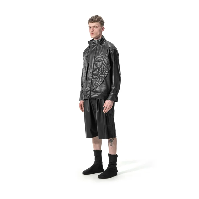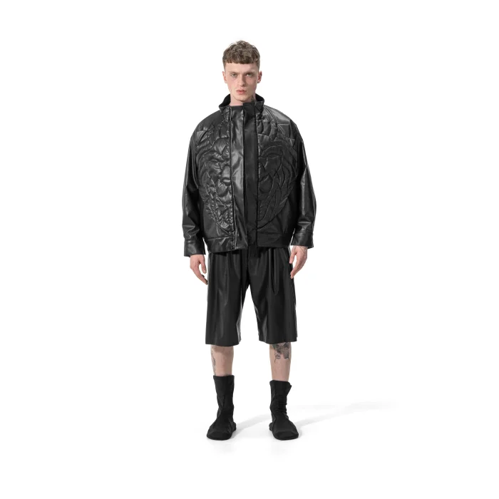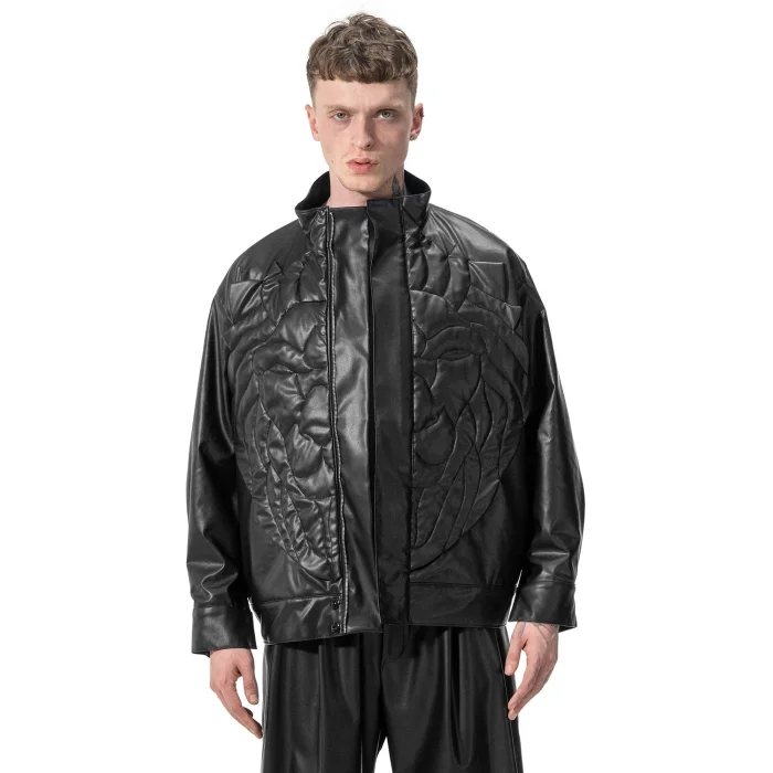 Eco leather jacket with a relaxed cut, stand-up collar, lining, front detail supported with fiber, and lion face embroidery with stitching. Zipper and snap