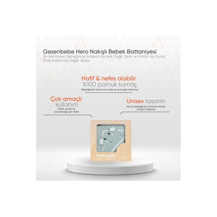 Product Description:Gezenbebe Hero Embroidered Baby Blanket: A Perfect Gift for Your Baby Prepared with Gezenbebe's Signature Heroes! Decorated with Gezenbebe's unique pattern and cute heroes Elephant, Koala, Teddy Bear and Rabbit on his bed, stroller or car seat, the Gezenbebe Hero Embroidered Baby Blanket keeps your baby warm and comfortable. Feature Highlights:? GEZENBEBE'S ORIGINAL DESIGN: This is not just a baby blanket; It is a style statement with Gezenbebe's striking pattern and fine embroidery details. ? SOFTNESS AND COMFORT: With its lightweight construction, this embroidered blanket is ideal for strollers and car seats. It is produced using 100% cotton and prioritizes your baby's comfort with its breathable structure. ? QUALITY COTTON FABRIC: Gezenbebe Hero Embroidered Baby Blanket is designed with 100% breathable cotton, it offers the gentlest touch to your baby's skin.? UNIQUE PATTERN & CUTE MASCOTS: On the blanket, Gezenbebe's mascots, Elephant, Koala, Teddy Bear and Rabbit, offer both comfort and style. ? STYLE SUITABLE FOR BOTH GENDERS: With its modern patterns and unisex design, this blanket is always with your baby. Technical Details: Color Options: Bunny, Elephant, Koala, Teddy (Organic). This special blanket, prepared with the quality of gezenbebe, makes your baby's most precious moments even more special. It offers your baby not only warmth, but also elegance and comfort. Choose the best one for your baby now!