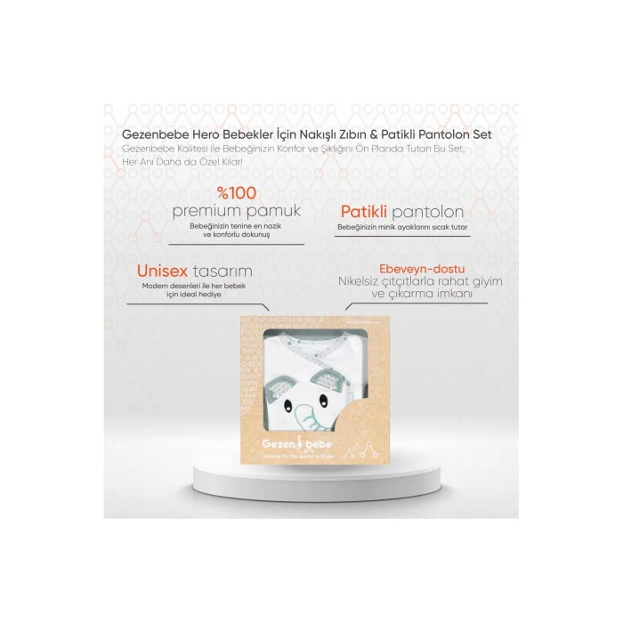 Product Description: Gezenbebe Hero Embroidered Booties & Booties for Babies Set: The Ideal Touch for Your Baby's Sensitive Skin with Gezenbebe's Original Heroes! If you're looking for the perfect touch for your baby, this is the place to be. Wrap your baby's delicate skin in the most special way with Gezenbebe's unique heroes, Elephant, Koala, Teddy Bear and Rabbit. Standout Features:GEZENBEBE'S UNIQUE DESIGN: This isn't just a baby body and pants set; It is a style statement of Gezenbebe with its exquisite patterns and exquisite embroidery. PREMIUM COTTON FABRIC: Made with 100% breathable cotton, this set offers the softest touch to your baby's skin.SIGNATURE PATTERN & HERO MASCOTS: Gezenbebe's unique design crowns your baby's comfort and elegance with the Elephant, Koala, Teddy Bear and Rabbit mascots. UNISEX STYLE: With its modern patterns, it is ideal for both baby boys and girls. DON'T LET THE LITTLE FEET GET COLD: Booties with mascot embroidery detail keep the tiny feet warm. NICKEL-free: The nickel-free snap design allows your baby to dress up and take off comfortably. ALWAYS FOR THE BETTER: We are constantly improving our products by taking into account customer feedback. Technical Details:Size Options: 0-3 months, 3-6 months, 6-9 months. Color Options: Bunny, Elephant, Koala, Teddy (Organic)Please carefully review the size and color options before ordering. Make every moment more special with this set designed for your baby's comfort and elegance with the quality of gezenbebe!