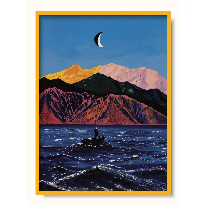 A person standing inside a small boat on a rough sea, colorful mountains and a crescent moon in the background.