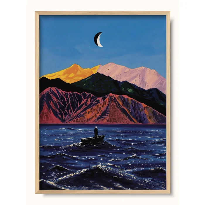 A person standing inside a small boat on a rough sea, colorful mountains and a crescent moon in the background.