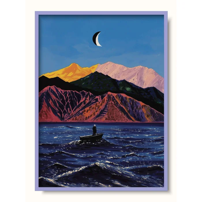 A person standing inside a small boat on a rough sea, colorful mountains and a crescent moon in the background.