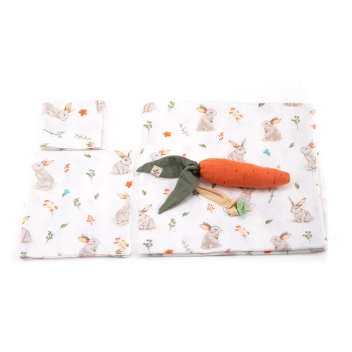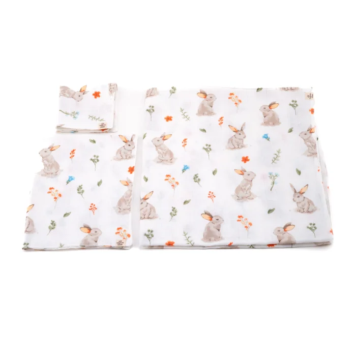 The products can be used on both sides. The pattern is present on both sides of both the blanket and the shoulder cloths. The nature bunny-themed muslin set is soft, breathable, and gentle on your newborn's skin.